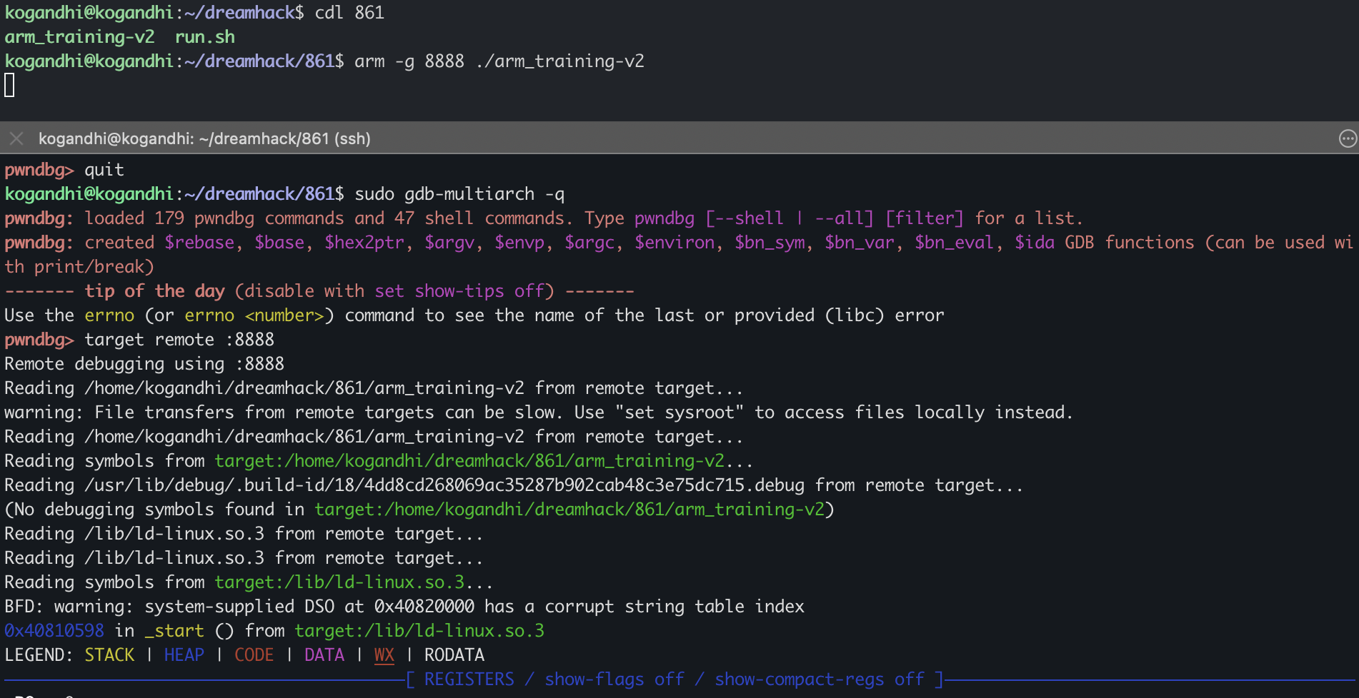 다른 터미널 세션에서 gdb-multiarch를 실행하고 target remote :{port}로 연결하면 디버깅을 진행할 수 있다