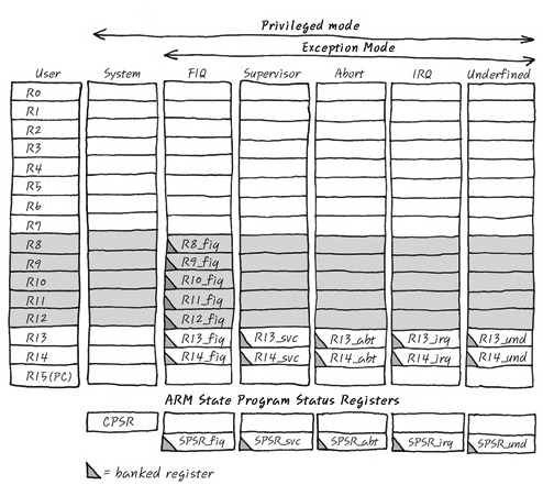 User, FIQ(Fast IRQ), IRQ(Interrupt Request), SVC(Supervisor), Abort, Undefiend, System